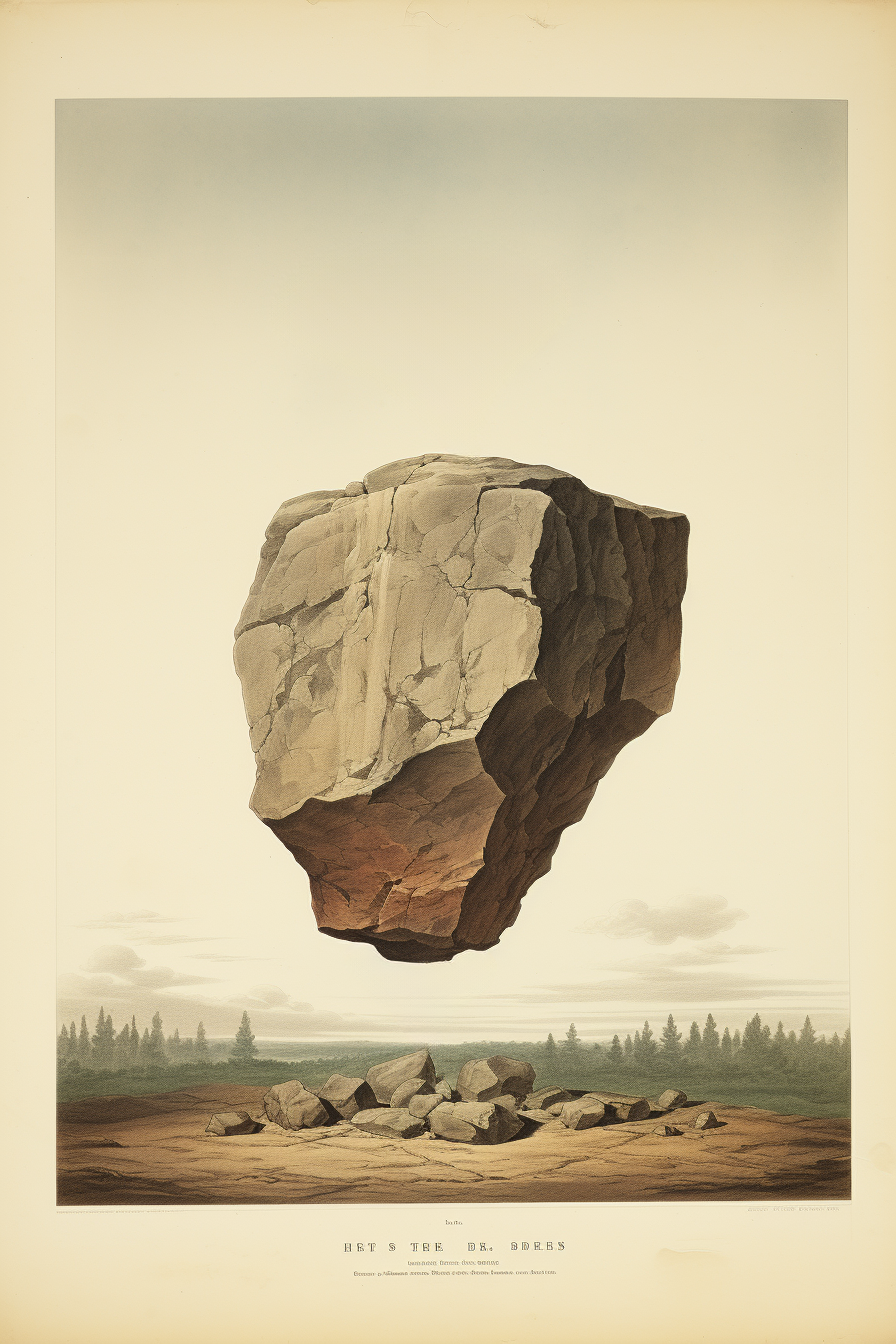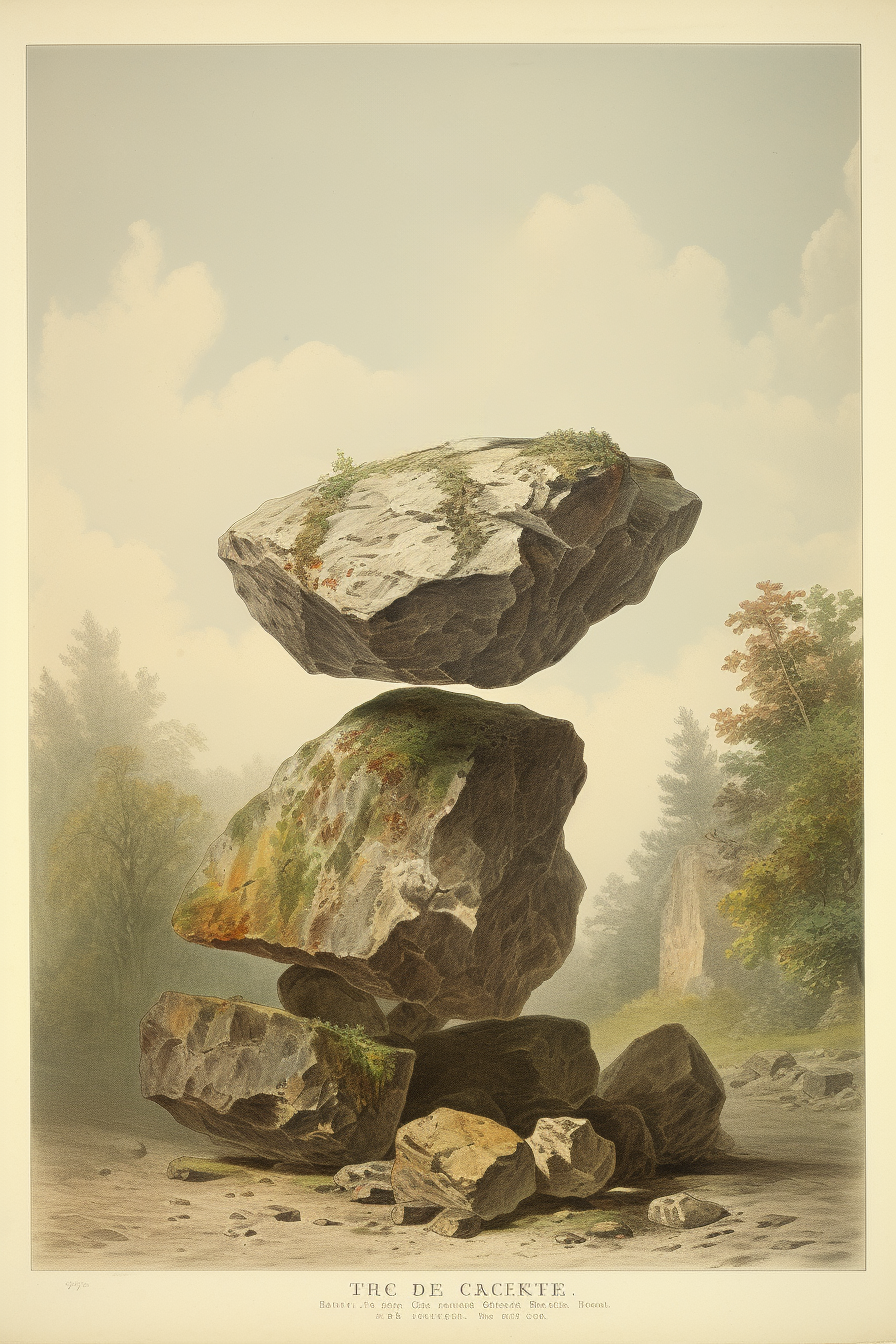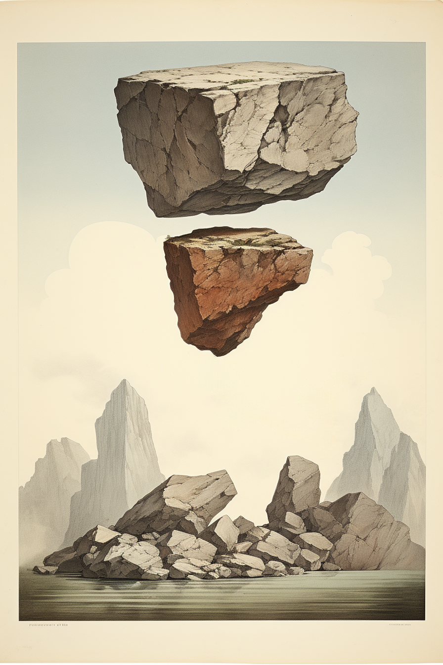 The "floating rocks" project has been meticulously created through a careful iterative process using Midjourney and Adobe Firefly artificial intelligence.